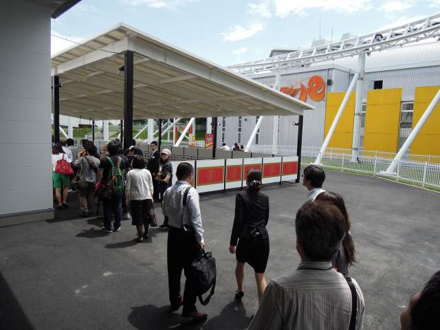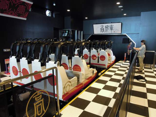 高飛車スタッフのコスチューム(居酒屋、と評されるようだ)、朱色の通路は優先券専用