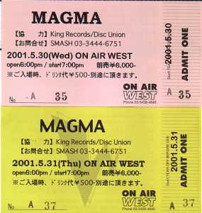 2001/03/17 (Sat) 11:00 チケット発売。 新宿Disc Union 4F(旧プログレッシブ・ロック・フロア)にて。 筆者は寝坊し、発売時刻ギリギリに到着。両日、整理番号30番台のチケットを入手。オマケとして「MAGMA傘」をもらう。 1桁チケットを入手するには、8:00AM 頃から待てばOKだったそうだ。 2001/05/27 (Sun) Osaka - Club Quattro 2001/05/28 (Mon) Kyoto - Muse Hall |
