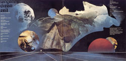 表紙の日食と、裏表紙の月面(図A)に象徴される、いわゆる「宇宙サウンド」。 見開きは(図B)鍾乳洞を思わせるデザインで、どちらも瞑想的なイメージである。 図Bの「地平線」上に立っている白い人物(画像では点にしか見えない)は、フローゼの息子ジェローム(Jerome Froese)である。 それでは、以降に古いCDのアートワークを載せてみる。 |